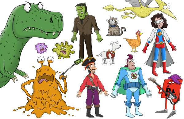 We had a huge cast of characters to create with every sketch having brand new characters in each. This cast list included a chicken, a dog, a mad scientist, a star, a Martian, a sea monster, a Mars rover, a T-Rex, a Pterodactyl, a Plesiosaurus, bacteria, a volcano, an element from the periodic table, a meteor and... well we'll stop there. And what do all these characters have in common? Not a lot! So our rigging team was kept comfortably on their toes to create the digital puppets required for all these weird and wonderful characters.