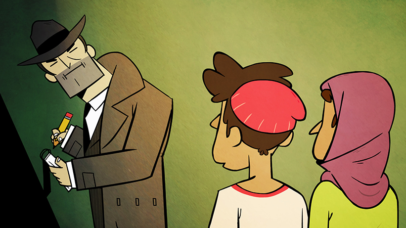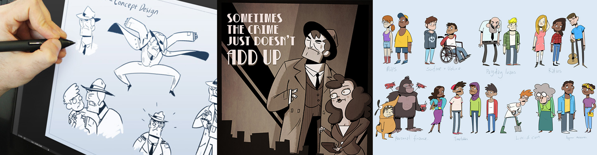 We wanted the humour and the visual style to feel surreal but somehow believable. We developed the character Al Gebra, a gumshoe private detective who solves maths crimes committed in everyday life. Unannounced and uninvited Al would appear randomly and solve people’s real life maths problems, narrating his own life as if he were in a film noir cinematic masterpiece and issuing obscure insults along with practical advice. Starting with the intended learning objectives, we worked closely with educational consultants to produce eight scripts that clearly explained the mathematical concepts.