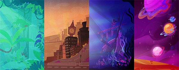 Accessibility is always at the forefront in the work we do for Eye Gaze Games. Specific care and attention is given to all control schemes from dwell clicking buttons using an Eyegaze device to navigating menus using a gamepad. Large and clear buttons with colour and contrast guide the player’s eyes and attention through the game. Backgrounds have lower contrast so as not to distract however let’s take a moment now to distract ourselves with the beautiful artwork.