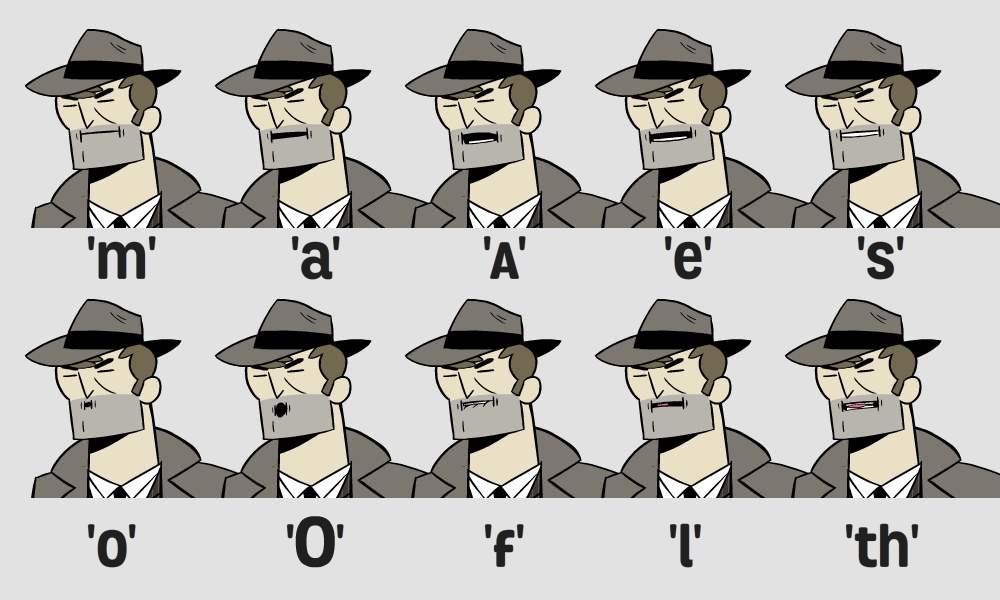 Lip sync can be a great opportunity for humour. Below are the mouth shapes for “Maths Mutt”, the genius talking dog that helps his owner solve maths problems in a series we created for BBC Bitesize. Maths Mutt is a bit of a loud mouth, know-it-all and this is reflected in his mouth shapes for lip sync. There is a pretty extreme contrast in the various shapes which makes for an exaggerated movement when he talks, bringing his absurd nature front and centre in his characterisation.